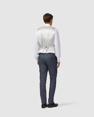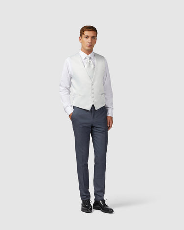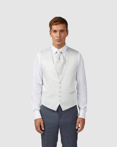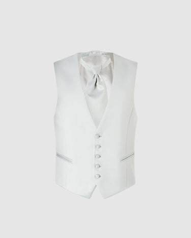 Slim fit pearl grey single breasted satin vest by Carlo Pignatelli, featuring 5 fabric-lined buttons and welt pockets. Matching satin ascot.