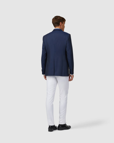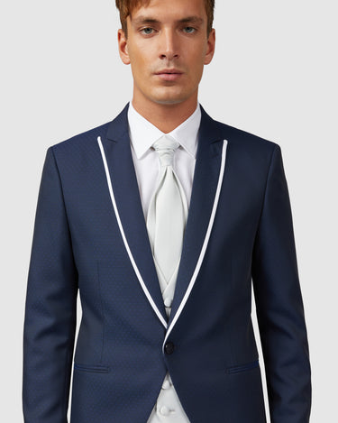 Slim fit matching blue suit by Carlo Pignatelli, featuring a one-button jacket with peaked collar and contrast piping, central back slit, 5 button vest, ascot and trousers.