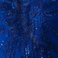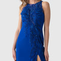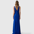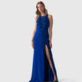 Vestido largo entallado bluette en crepé de Carlo Pignatelli, con bordado a juego, escote americano, abertura lateral y escote en V profundo en la espalda. Estola de georgette a juego.