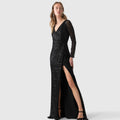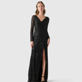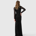 Vestido largo entallado de tul negro con bordados