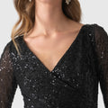 Vestido largo negro entallado en tul bordado de Carlo Pignatelli, con escote cruzado y bordados a juego, manga larga de guante y abertura lateral. Estola de georgette a juego.