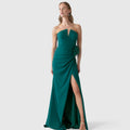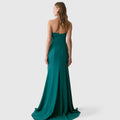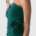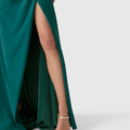 Vestido largo ajustado en crêpe verde petróleo firmado por Carlo Pignatelli, con escote en forma de corazón, drapeado en el corpiño y abertura lateral. Estola de georgette a juego incluida.