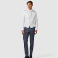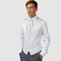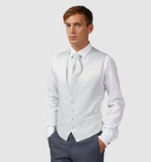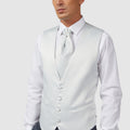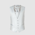 Chaleco entallado con botonadura sencilla de Carlo Pignatelli. De satén gris perla, con 4 botones forrados de tela y bolsillos ribeteados. Ascot de raso a juego con ligero pespunte.