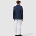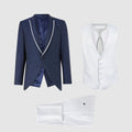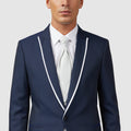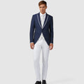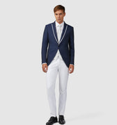 Traje slim fit azul coordinado de Carlo Pignatelli, compuesto por chaqueta de un botón con cuello de lanza y ribetes en contraste, abertura central trasera, chaleco de 5 botones, ascot y pantalón.
