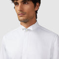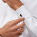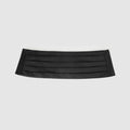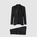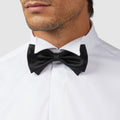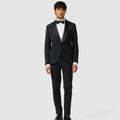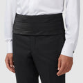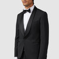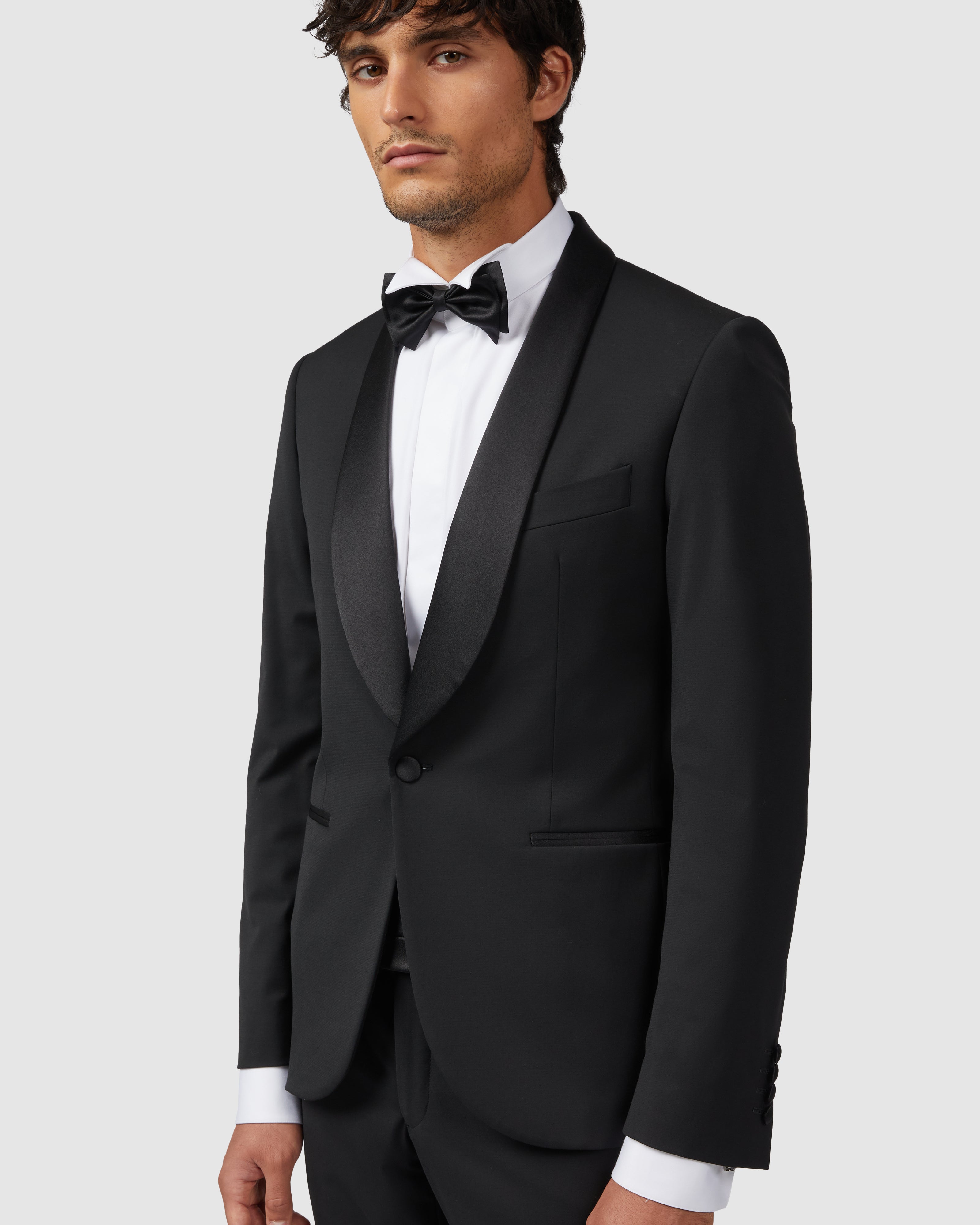 Total look black-tie de Carlo Pignatelli, epítome de la elegancia formal masculina. Compuesto por impecable smoking negro confort con chaqueta y pantalón de cuello chal de raso de un botón, camisa blanca con cuello diplomático, pajarita y fajín de raso negro y gemelos.