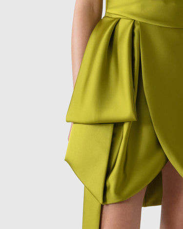 Robe bustier courte en satin vert de Carlo Pignatelli, avec jupe portefeuille, décolleté asymétrique, corsage drapé et motif origami sur le côté. Étole en georgette assortie.