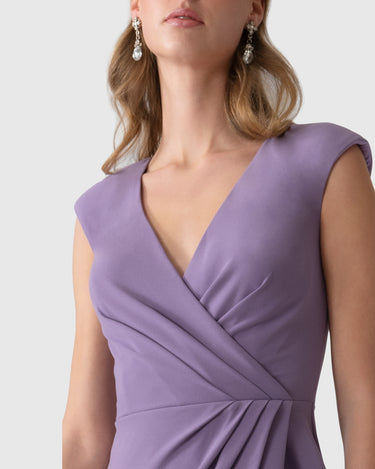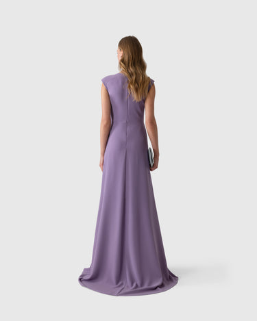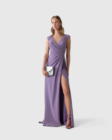 Robe longue en crêpe lilas signée Carlo Pignatelli, avec décolleté croisé drapé, bretelles légèrement rembourrées et fente latérale profonde sur la jupe. Étole assortie en georgette.