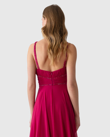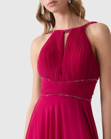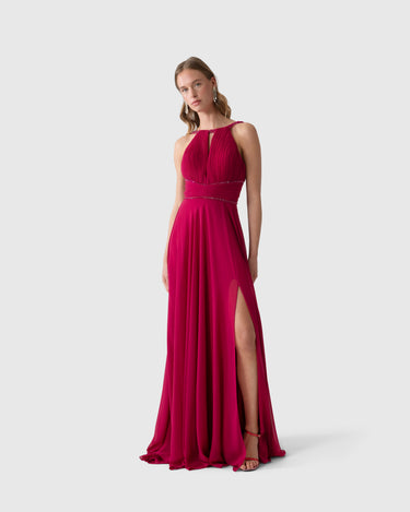 Robe longue en georgette magenta signée Carlo Pignatelli, avec broderie ton sur ton encadrant l'encolure américaine et détail plissé à la taille. Fente latérale sur la jupe évasée. Étole assortie en georgette.