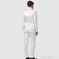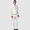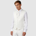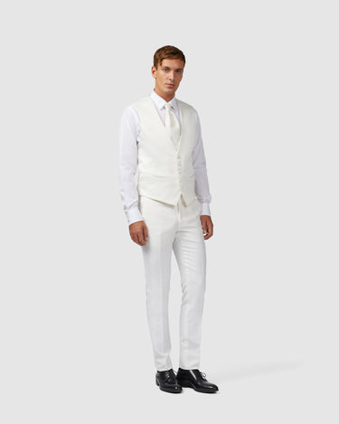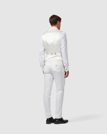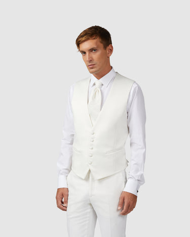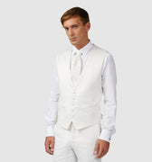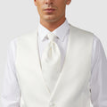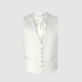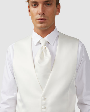 Gilet monopetto slim fit firmato Carlo Pignatelli. In satin avorio, con 5 bottoni foderati in tessuto e tasche filetto. Ascot abbinato in satin.